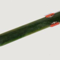 Ouvre lettre en néphrite vert épinard agrémenté en sa prise de deux barrettes en or 18K serties d’un rang godronné en corail rouge encadré d’un filet d’émail noir surmonté d’un pavage de petits brillants. Vers 1920. (Dim. : 230 x 38 mm) (manque un élément d'émail et un brillant) Bien que ne présentant aucun poinçon, ce travail rare est d’une réelle qualité. Il est à rapprocher des productions réalisées par les grandes maisons de joaillerie telles que Cartier ou Fabergé ou Boucheron qui ont produit ce type d’œuvre.