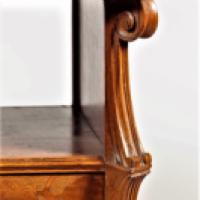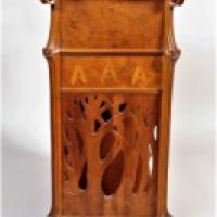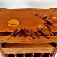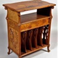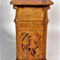 Meuble à musique en noyer, placage de noyer et marqueterie, le plateau, à découpe mouvementée, marqueté d'un décor d'oiseaux saluant le lever du soleil, les côtés plaqués de loupe sur le registre supérieur. le registre médian est marqueté d'un décor de portée musicale en clef de sol notée sur le côté gauche, il ouvre par un tiroir à boutons de tirage en bronze représentant un papillon en façade, et est marqueté d'un décor de cigales sur le côté droit. Le registre inférieur, dont les côtés ajourés sont à décor de clochettes à gauche et de troncs d'une forêt à droite, présente quatre compartiments verticaux pour les partitions, séparés par des cloisons, elles aussi ajourées en forêt. Les montants moulurés et disposés à pans coupés, terminés part des enroulements à l'imitation d'une volute de violon.