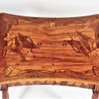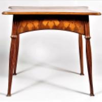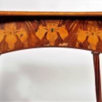 Camille Gauthier était créateur de marqueteries pour Louis Majorelle. En juillet 1900, il quitte la maison Majorelle et s'installe à son propre compte. Comptant parmi les chefs de file de l'Ecole de Nancy, il présente une série de meubles lors de l'exposition de l'Ecole de Nancy au pavillon de Marsan en 1903. Une table similaire à la nôtre figure dans le catalogue des petits meubles présentés lors de cette exposition. Il existe deux versions de notre table (une signée Majorelle et l'autre non signée), ce qui accréditerait l'idée que Gauthier était le vrai créateur du modèle pour Majorelle et qu'il a continué à le produire après son départ.