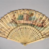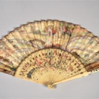 Eventail de type plié en ivoire, à 25 brins, les panaches ajourés et chantournés. La feuille en parchemin peint à la gouache d'une scène de manoeuvres militaires; Les bordures sont renforcées d'une bandelette de bordage dorée. Les brins, à découpe alternée en serpentin crenelé et droite, sont peints d'une fontaine, d'oiseau et de papillons dans des bouquets de fleurs.