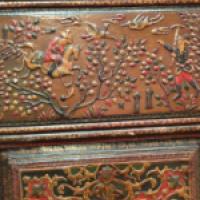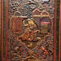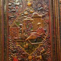 Paire de ventaux en bois laqué en relief dans le style Safavide, à riche décors de personnages et d'animaux dans des réserves. Inscriptions en Farsi.
