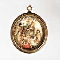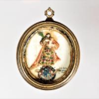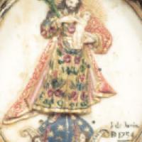Médaillon en ivoire sculpté en bas-relief, rehaussé de polychromie et dorure représentant sur une face une Vierge triomphante couronnée par deux anges tenant l'Enfant sur son bras gauche, imposant la chasuble à st Ildefonse de Tolède. Sur l'autre face, le Christ portant un enfant, surmontant un globe céleste agrémenté d'un phylactère porté par deux têtes d'anges, portant la mention "REFUGIUM AGONIZANTUM" (sic).