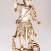 Saint Michel terrassant le démon en ivoire sculpté en ronde bosse, anciennement polychromé et doré. Il est représenté debout, ceint d’une écharpe en bandoulière et levant sa lance.
