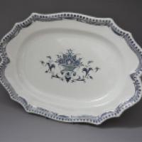 Grand plat ovale à bords contourné à décor d'une corbeille de fleurs et fruits en camaïeu bleu.
