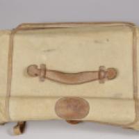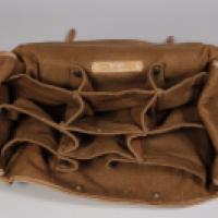 Sacoche de transport pour chaussures en toile sable à garnitures de cuir brun, intérieur à compartiments.