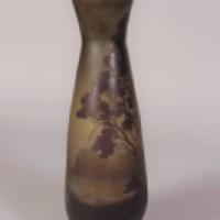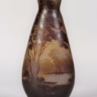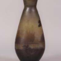 Vase en verre multicouche, de forme balustre légèrement méplat. Décor gravé en réserve d'une barque, d'un plan d'eau, d'arbres et de bosquets en perspective. Couleurs contrastées brun foncé, marron et vert sur un fond jaune et vert. Signé «Gallé» en réserve.