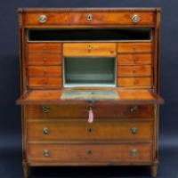 Secretaire en armoire formant commode en placage d'acajou avec encadrement marqueté de losanges sur un fond de citronnier. Montants à pans coupés en palissandre. Il ouvre en partie haute à un tiroir et en partie basse à trois tiroirs. Ouvert, l'abattant central tendu de cuir vert démasque huit tiroirs et deux casiers. Il repose sur quatre pieds gaine - XVIIIe siècle - H. 148 cm, L. 120 cm, P. 53 cm (restaurations)