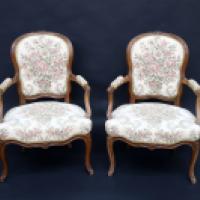 Paire de fauteuils en bois naturel, mouluré et sculpté à dossier cabriolet orné de fleurettes ainsi qu'en ceinture, quatre pieds cambrés.