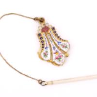 Carnet de bal en métal doré en forme de fleur de Lys à décor émaillé de fleurs et d'étoiles, support en os, chainette reliée à un crayon à papier marqué A. W. FABER