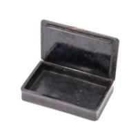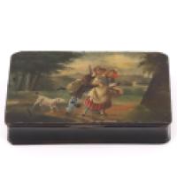 Boîte à priser en bois noirçi, à décor peint d'une scène galante entre un chasseur et une paysanne -XIXe siècle- H. 2 cm, L. 10,5 cm, P. 6,5 cm - (petits manques)