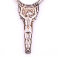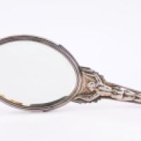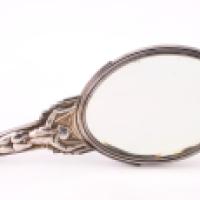 Face à main double face en bronze argenté figurant une jeune femme debout, nue, de dos, soutenant une draperie, glaces biseautées.