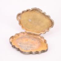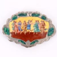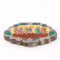 Boîte à poudre en métal argenté à décor peint d'une scène de danse antique et entourage à l'imitation de la malachite, revers ciselé d'une large feuille d'acanthe -