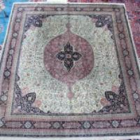 Tapis centré d'une large fleurette se détachant d'un médaillon rouge brique entouré de rinceaux feuillagé sur fond ivoire, quatre écoinçon bleu nuit, bordure principale à caissons entourée de quatre contrebordures à fleurettes