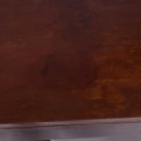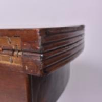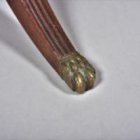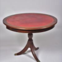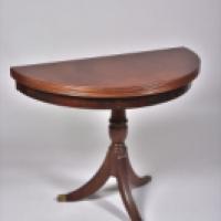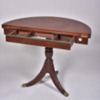 Table jeu en acajou et placage d'acajou de style Regency en demie lune formant console, ouvrant par un plateau grani de cuir rouge et un tiroir dissimulé, reposant sur un fût centrale terminé par quatre pieds incurvés garnis de sabots en bronze.