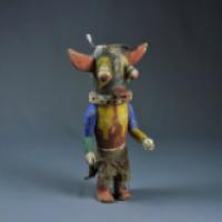 La kachina vache porte un masque à fond noir aux yeux proéminents tombants, larmés de jaune, surmonté d'un toupet de plume encadré de cornes rouges. Le mufle, sculpté, est également peint en rouge. Le bas du masque porte une collerette à pois rouges et bleus.