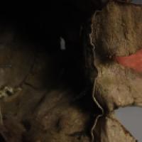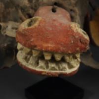 Un mufle, également en cottonwood sculpté est fixé à la face par des lacets de cuir.