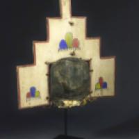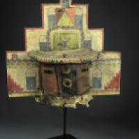 Masque heaume surmonté d'une tabletta à quatre gradins et deux registres en bois peint à fond blanc orné de motifs phaliques pouvant évoquer les épis de maïs. Au centre se trouve un triangle noir renversé en équilibre sur un autre triangle sur fond jaune. Le revers de la tabletta est peint à fond blanc, et orné de trois nuages de pluie trilobés. Les couleurs correspondant aux points cardinaux se succèdent au sein de chaque nuage dans un rythme d'alternance :