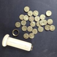 Cachet à système en ivoire (elephantidae spp) tourné et bague en laiton dissimulant 24 sceaux en laiton bifaces et interchangeables gravés de formules explicitées par des symboles : - Nul n’en pénètre le secret (ruche) // Pour toujours (nuées) - Elle m’a bien conduit (étoile) // Le froid me chasse (colombe) - Vous en avez la clef (cadenas en forme de cœur) // Le dénouera qui pourra (corde nouée en 8) - Attention au tems (sablier) // N’en parlez pas (Fleur, pensée) - Le tems nous unira (montre de gousset) // Le trop m’accable (épi de blé fané) - Bon voyage (montgolfière) // Fier mais sensible (cheval cabré) - Agitée mais constante (boussole) // Elle console mais ne suffit pas (enveloppe fermée) - Telle est la vie (bateau) // Qu’il veille sur vous (œil dans les nuées > Dieu) - Doucement mais sûre (tortue) // Je reviendrai (soleil derrière les montagnes) - Prenez garde à vous (serpent dans les hautes herbes) // Liberté, liberté, liberté chérie (cheval cabré) - Qui me néglige me perd (cage ouverte et oiseau s’envolant) // Où me conduira-t-elle ? (Homme à bord d’une barque, ramant) - Toujours le même (lion et son reflet dans un miroir) // Ma douleur cause ma fuite (chevreuil blessé par une flèche, fuyant) - A bon chat bon rat (chat et rat) // L’espérance me soutient (ancre) - Je me consume pour éclairer (lampe à huile) // A qui touche je réponds (lyre) - En vain le destin nous sépare (deux arbres rapprochés par les feuillages mais séparés par une rivière) // Se rejoindre ou mourir (serpent coupé en deux) - Calme au sein des orages (orage) // Je ne recule jamais (soleil rayonnant) - Rien sans peine (Angelot grimpant sur une échelle au sommet de laquelle se trouvent des cœurs) // L’épreuve du tems (arbre) - Paix ! (Angelot) // Je languis loin de toi (fleur) - Plus loin plus serré (deux fleurs reliées par une même tige formant un 8) // Toujours sincère (plume) - L’obstacle excite mon ardeur (cheval sautant un obstacle) // Répondez vite (oiseau en vol tenant dans son bec une enveloppe) - Le diable emporte l’amour (diable) // Prenez garde (malle ouverte) - Je suis pressé (chien tenant dans sa gueule une enveloppe) // Chut ! Chut ! (Angelot tenant un objet dans sa main) - Vous la vérité (pomme) // Toujours d’accord (harpe) - Va où je voudrais être (enveloppe fermée) // Je meurs ou je m’attache (tronc mort entouré de lierre) Travail de la fin du XIXe siècle. Poids brut (sans la bague en laiton et les sceaux) : 70,5 g (fentes au fût)