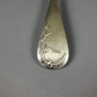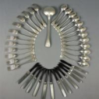 Ménagère en métal argenté composée de douze fourchettes de table, douze cuillers à soupe, une louche, modèle uni plat à cartouche fleuri gravé du chiffre L.H.