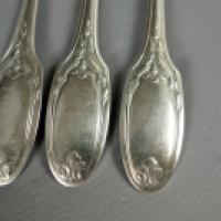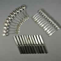 Partie de ménagère en métal argenté modèle lauriers Louis XVI composée de douze fourchettes de table, onze cuillers à soupe. On y joint une suite de douze couteaux de table à manche en bois noirci et lame en acier.