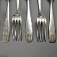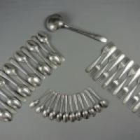 Ménagère en métal argenté composée de douze grands couverts, une louche et douze petites cuillers modèle Art Déco.
