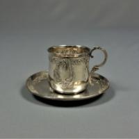 Tasse et sa sous tasse en argent estampé à décor de rinceaux feuillagés.