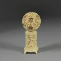 Boule de Canton en ivoire sculpté à décor de dragon. Reposant sur un support cylindrique ajouré à décor de dragon.