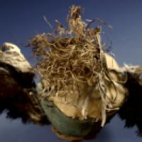 Cuir, pigments vert, noir, ocre et brun, plumes, crin, fibres végétales.