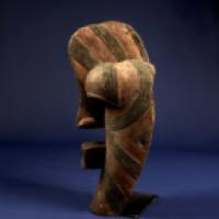 Masque d’un visage scarifié à fond brun rouge, scarifications noires.