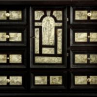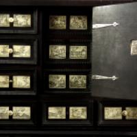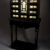Cabinet de forme rectangulaire en placage toutes façes de bois noirci et filets de bois clair dans le goût du XVIIème siècle, ouvrant par sept tiroirs dont trois simulés en façade et une porte centrale découvrant trois tiroirs. les tiroirs sont plaqués d'os à décor gravé de scènes champêtres à l'encre et agrémentés de boutons de tirage en os finement tourné en deux parties avec pas de vis. La porte centrale est décorée d'une allégorie de l'architecture représentée par une femme tenant un compas dans la main gauche et une équerre dans la main droite. L'ensemble repose sur une table de présentation en bois noirci ouvrant par un tiroir en façade, reposant sur quatre pieds tournés reliés par une tablette d'entretoise.