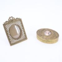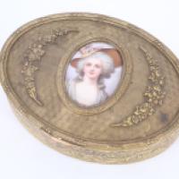 Lot composé d'une boîte en laiton de forme ovale de style Louis XVI ornée sur le couvercle d'une miniature ovale sur porcelaine représentnant Marie Antoinette, et un cadre à photo de style Louis XVI à vue ovale en laiton.