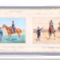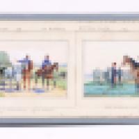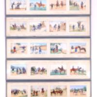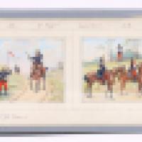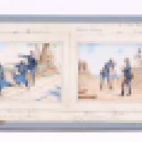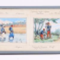Bel ensemble de vingt vignettes à l'aquarelle sur papier réparties dans cinq montages sous verre représentant les types militaires et uniformes de l'armée française. Chaque vignette numérotée et commentée ( zouaves, tirailleurs algériens, infanterie légère d'Afrique...)