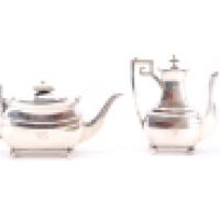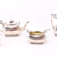 Service à thé et café en argent composé d'une théière, une cafetière, un sucrier et un pot à lait, la prise à décor de grecques.