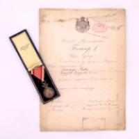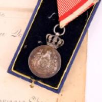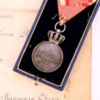 Médaille de la maison Royale Obrenovitch en argent surmontée d'une courone fermée avec son ruban rouge et blac.Dans sa boîte Arthus Bertrand, accompagnée de son brevet n° 1133 adressé à léonard Picat, brigadier de la garde, daté du 5 novembre 1911. Cachet du traducteur G.T. Petrovitch traducteur près la Cour d'Appel de Peris.