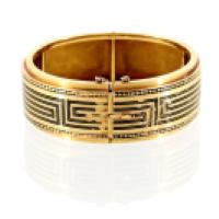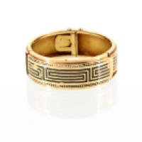 Bracelet jonc articulé ovale en or jaune 750/°°, à décor incrusté de grecques en émail noir. Chaïne de sécurité.