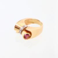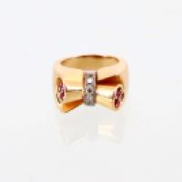Bague en or jaune 750/°°, ornée aux extrêmités du rouleau de 6 petites pierres rouges, centrée d'un bandeau en or gris serti d'une rangée de 6 petits brillants.