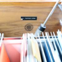 Bureau à plateau écritoire rectangulaire en mélaminé blanc ouvrant à une trappe découvrant différents compartiments de rangement de dossiers suspendus fermant à clé et à quatre tiroirs en ceinture.