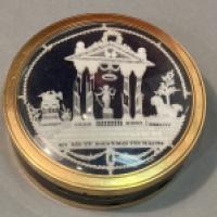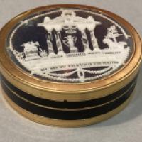 Boite de forme circulaire d'époque Louis XVI en écaille brune (Eretmochélys imbricata), cerclée d'or 750/1000ème, ornée sur le couvercle d'un décor sous verre en dentelle d'ivoire (elephas maximus ou loxodonta africana) repercé représentant un temple de l'amour abritant Cupidon sous un fronton orné de deux coeurs, sommé d'une couronne de roses et supporté par 4 colonnes. De part et d'autre du temple se trouvent un chien et deux colombes portant les mentions Fidélité et Constance. sous les trois degrés supportant le temple est portée la devise : "Qui que tu sois voici ton maitre", poinçons non identifiés sur la monture (légers accidents à l'ivoire et petits manques à l'écaille), travail probablement dieppois du dernier quart du XVIIIème siècle, à rapprocher des productions de l'atelier de Jean-Antoine Belleteste (1731-1811).