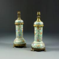 Paire de lampes en porcelaine à décor à l'émail de dragons dans le goût chinois, montées à l'électricité dans une garniture en bronze.
