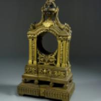 Caisse de pendule en bronze doré de style louis XVI, à décors de pilastres, cornes d'abondance et rinceaux feuillagés, reposant sur une base rectangulaire.