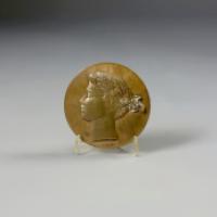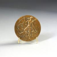 Médaille en bronze présentant un profil de jeune femme signé Belmondo en dessous. Sur l'avers, Diane tenant un arc avec ses chiens.