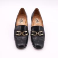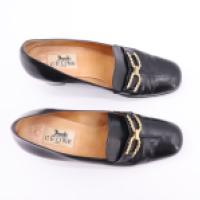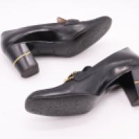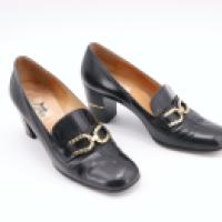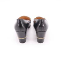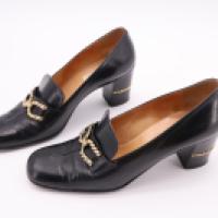 Paire d'escarpins en cuir noir, chaîne en métal doré à mailles torsadées