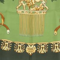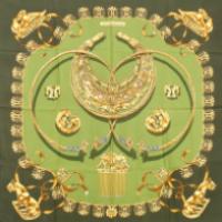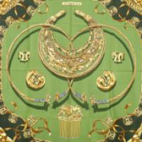 Carré en satin de soie imprimé, modèle "Les Cavaliers d'Or" (en référence au peuple scythe), signature de la maison, signature de l'artiste