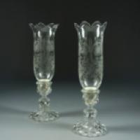 Paire de bougeoirs à fût torsadé et leur coupe-vent en cristal taillé et gravé