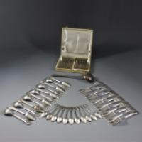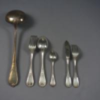 Lot composé de 12 couverts à poisson dans leur écrin, douze grands couvets de table et onze, petites cuillers, une louche en métal argenté.