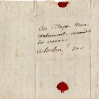 représentant du peuple. L.A.S. adressée au contramiral Vence à Toulon en date du 25 nivose an 6 (14 janvier 1798). 1 feuillet, trois pages. Cachet de cire rouge. Pliures et taches.