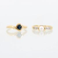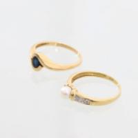 Lot de deux bagues en or jaune 750 millièmes 18 carats, l'une ornée d'une perle épaulée de petits brillants, l'autre ornée d'une pierre rouge en serti clos. TDD 55. PB. 4,5 g.