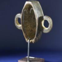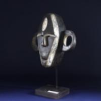 Masque guerrier Pongdudu monoxyle rehaussé de pigment blanc.