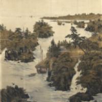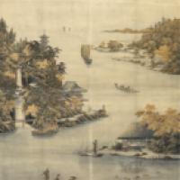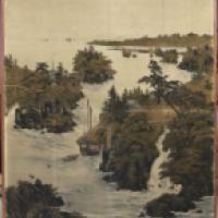 Paire d’importantes tentures en velours peint d’un décor de paysage animé. Montées sur châssis, encadrement de bois naturel.