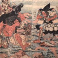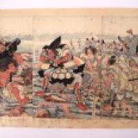 Triptyque Ukyio-e de trois feuillets au format oban tate-e collé sur papier.